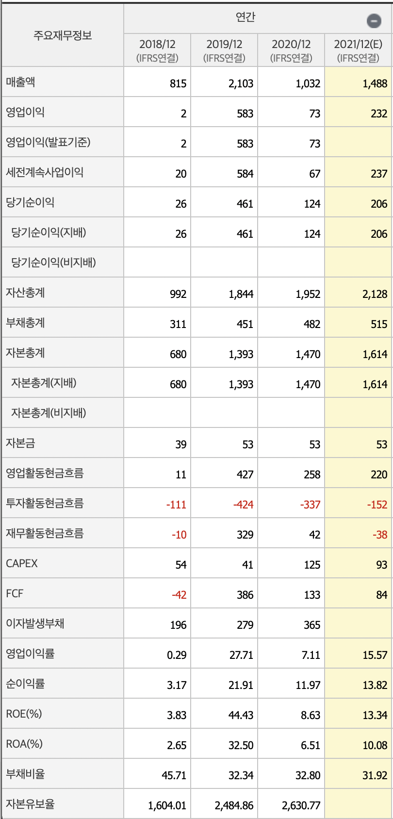 19,20년에는 + 로 돈을 끌어와서 쓰었으며, 2021년에는 - 38억 정도 상환할 예정으로 보입니다.
