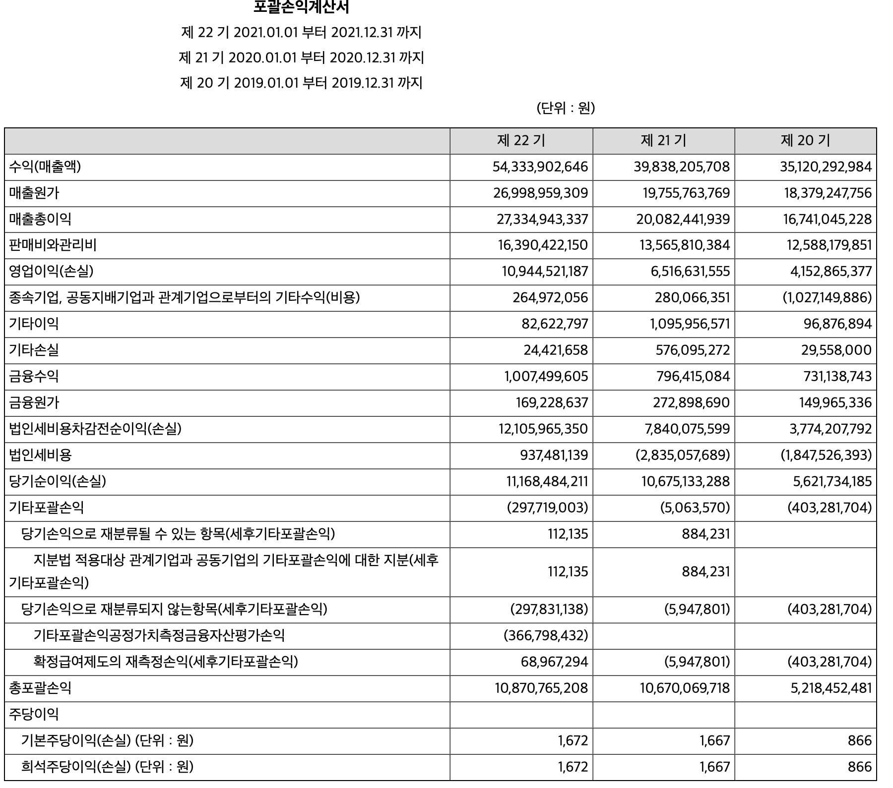 2020년 영업이익 65억에서 2021의 영업이익은 무려 109억입니다.